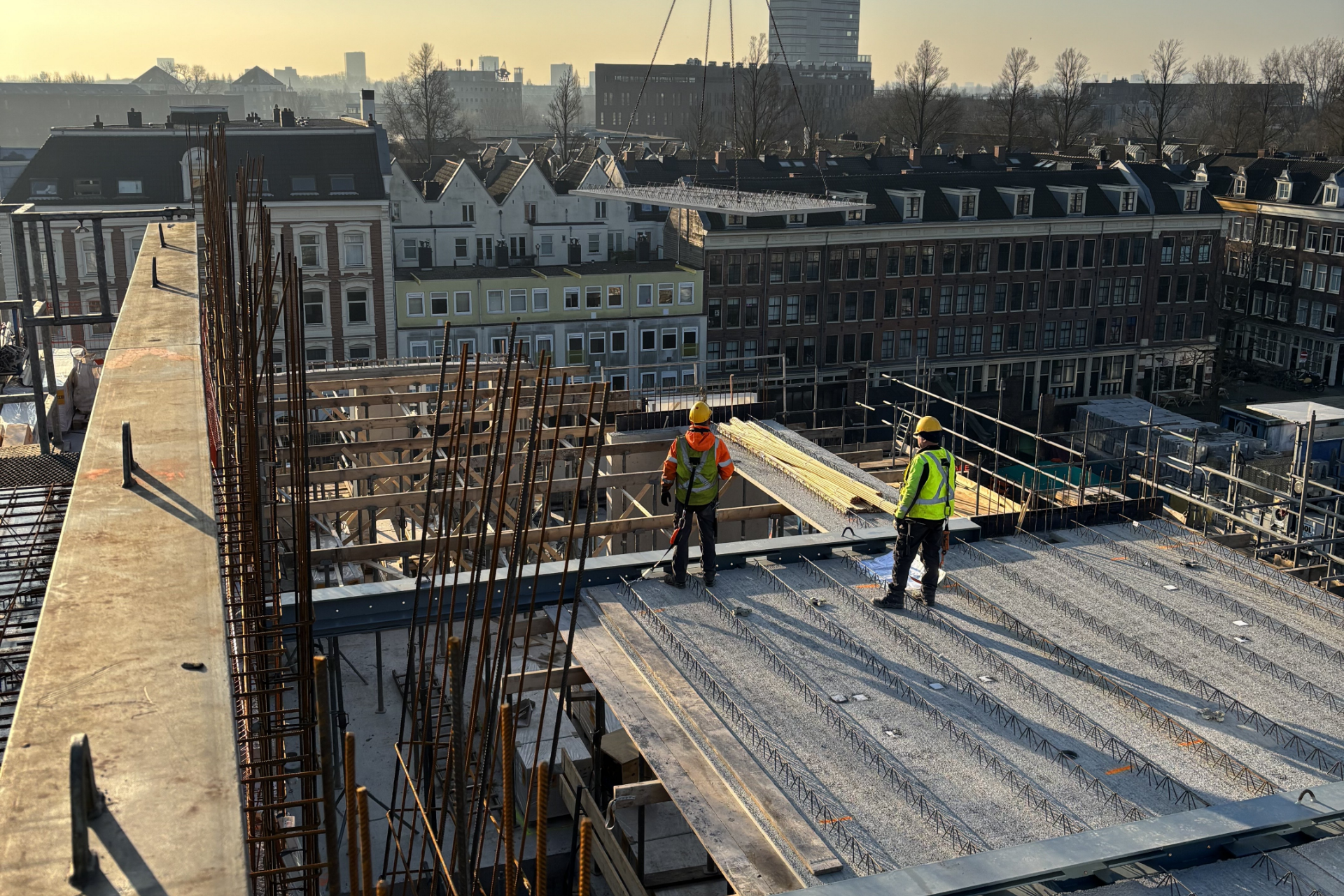 In maart zijn de breedplaatvloeren van het dak geplaatst en het dak gestort. Daarmee is het hoogste punt van het gebouw De Imker een feit – een belangrijk moment in het bouwproces. Van fundering tot dak, dit toekomstige ‘bijenparadijs’ staat er!